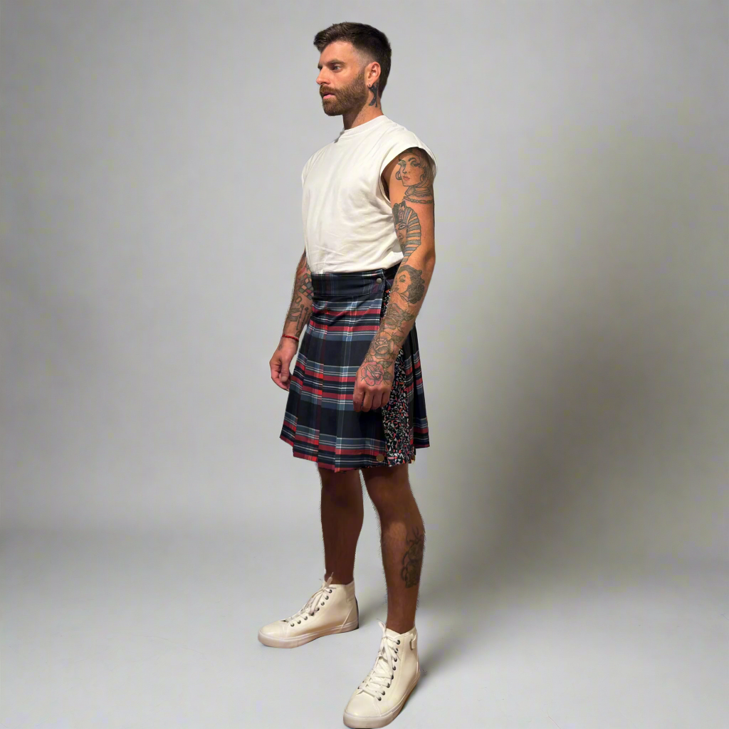 The Marina kilt brings playful charm with its exclusive plaid in classic colors and an abstract graphic under-apron design. Pleated all around for a harmonious look, it's perfect for adding bold style to your outfit. Pair it with a polo or a t-shirt for an effortlessly cool vibe that's ready for any occasion.